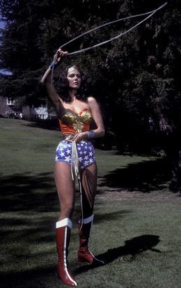 The second thing I noticed was that Lynda Carter, one of the most gorgeous faces I’ve ever seen on screen, with her light eyes and dark hair, would NEVER be cast in 2012.  She had actual thighs.  She had hips.  She looked like a woman.  She was Sophia Loren in a star-studded panty and eagle-emblazoned bustier.  When I was a little girl, she was everything I wanted to be.  I remember tying my hair in a knot, just so I could spin and shake my head and make the knot fall down just like she did.  I’d put on my Wonder Woman underoos, my red boots and tie a towel around my neck for a cape.  I made gold bracelets out of construction paper and pretended to deflect bullets by the chicken house in our backyard.  I wanted to BE that woman.